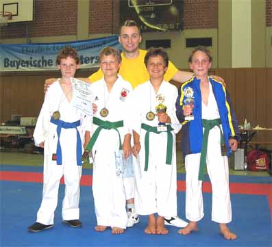 bayerischen Meisterschaft in Trostberg in den Disziplinen Kata (Kür gegen imaginäre Gegner), Kata Mannschaft und Kumite (freier Kampf) nach Gewichtsklassen an. In der Kata-Disziplin, in der das